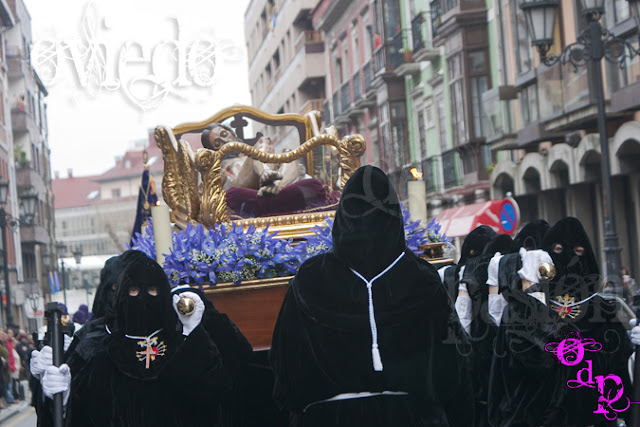 Tras la Cruz de Guía y Cruz Parroquial la banda de Gaitas Ciudad de Oviedo, tras ella los pasos de los mas pequeños, Morabetinos y Ecce Homo, a continuación el paso del Cristo Yacente , portado por mujeres, y acompañado por la Banda de cornetas y tambores de la Cofradía del Silencio y Santa Cruz de Oviedo. Por último, tras las filas de hermanos portando hachones, el paso de la Dolorosa a la que acompañaba la Banda de música Ciudad de Oviedo e inmediatamente tras el paso de la Dolorosa el clero, Hermano Mayor y representantes de las Cofradias y Hermandades de Oviedo.